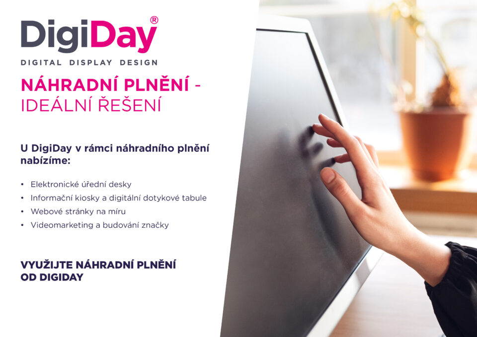 Náhradné plnenie je spôsob, ako môžu obce, mestá alebo spoločnosti splniť svoju zákonnú povinnosť zamestnávať ľudí so zdravotným postihnutím – a zároveň získavať komplexné služby od overeného dodávateľa. V DigiDay to znamená, že všetky naše činnosti, od výroby elektronických vývesných tabúľ a digitálnych panelov, cez inštaláciu a konfiguráciu, až po servis a správu obsahu, môžu byť vykonávané v rámci tohto programu.