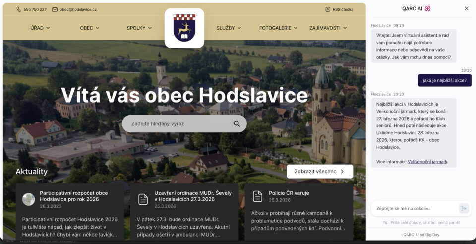 QARO AI momentálne beží v pilotnej prevádzke v troch obciach: Libochovany, Hodslavice a Divišov. Všetky tri majú web postavený na QARO a chatbot na ňom odpovedá na otázky ich občanov. Pilotné projekty nám ukazujú, ako sa chatbot správa v reálnej prevádzke, na aké otázky najčastejšie odpovedá a kde sú hranice jeho schopností. Na základe týchto skúseností QARO AI priebežne vylepšujeme.